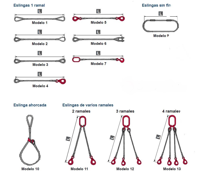 - Vendemos todo tipo de eslingas de cadena de diferentes modelos, longitudes y capacidades. Las eslingas de cable de acero se fabrican normalmente, con cables galvanizados en composiciones 6×19-FC, 6x36WS-FC o construcciones similares.